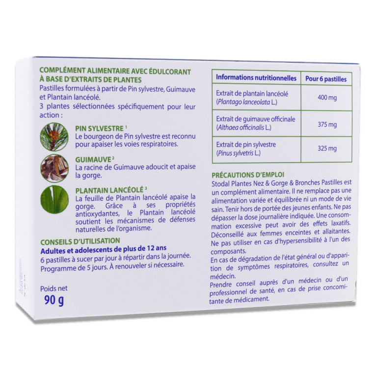 Le pin sylvestre est reconnu pour procurer une influence apaisante sur les voies respiratoires. La guimauve est utilisée pour son effet apaisant sur la gorge. Le plantain lancéolé participe également à l'apaisement sur la gorge et au soutien des défenses de l'organisme. Avec son agréable goût de citron, ce produit offre une expérience sensorielle plaisante tout en contribuant au bon fonctionnement des voies respiratoires.