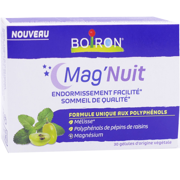 Le laboratoire BOIRON a conçu des médicaments homéopathiques, de soins d’hygiène et des compléments alimentaire pour toute la famille. MAG’NUIT est un complément alimentaire conditionné sous forme de gélules qui contient du magnésium, un extrait de mélisse, et des polyphénols de raisins. Dans cette formule, la mélisse contribue à trouver un meilleur sommeil et le magnésium favorise le fonctionnement normal du système nerveux.