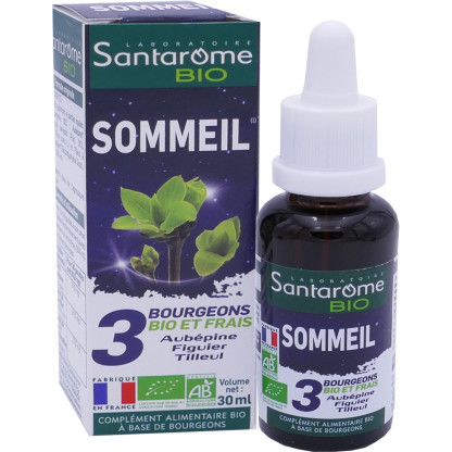 Sommeil Bio des laboratoires Santarome est un complément alimentaire Bio à base de bourgeons. Sa formule associe des bourgeons bio et frais d’Aubépine, du Figuier et du Tilleul. Dans cette formule l'aubépine est utilisée pour diminuer la nervosité et contribue à trouver un meilleur sommeil.