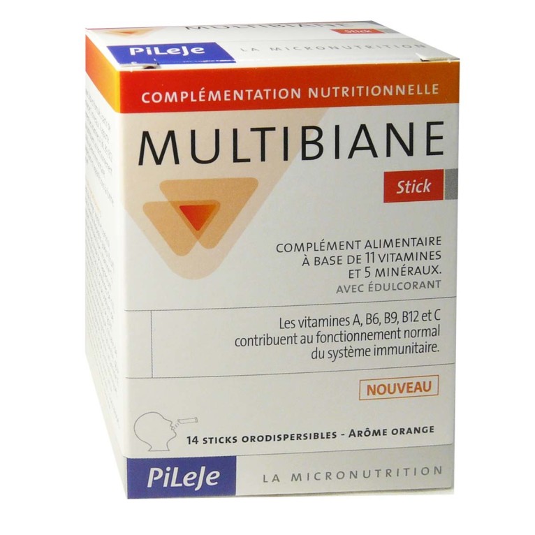 MULTIBIANE Stick du laboratoire PILEJE à prix discount, un complément alimentaire avec édulcorant conçu à partir de 11 vitamines et de 5 minéraux, en vente dans votre parapharmacie en ligne discount.