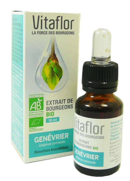 Extrait de Bourgeon bio de Genévrier de VITAFLOR, dans votre parapharmacie en ligne à prix discount, la gemmothérapie dans un complément alimentaire sous forme de flacon.