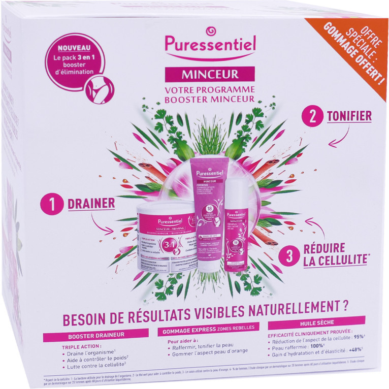 Le laboratoire Puressentiel propose depuis 2005 un large choix de produits d’aromathérapie et de cosmétique naturel formulés à base d’huiles essentielles et d’actifs issus de la nature pour assurer santé et bien-être à l’organisme dans le respect son environnement et pour lutter naturellement contre l'aspect de la cellulite, le Laboratoire Puressentiel a spécialement conçu une gamme de produits pour aider à affiner la silhouette, raffermir et tonifier la peau. PURESSENTIEL Programme Booster Minceur 3 soins est un programme minceur qui permet de retrouver un bon équilibre de vie. Sa formule aux actifs 100% d'origine naturelle composées d’huile essentielle de CITRON réputé pour ses vertus purifiantes, d’huile essentielle d' ORANGE SANGUINE connu pour son action détoxifiante et d’huile essentielle de PAMPLEMOUSSE l’allié minceur par excellence va booster et drainer pour un résultat 100% efficace complétée par l’association de la bardane pour le drainage de l'organisme, du thé vert pour le contrôler du poids, et du raisin contre la peau d'orange. Une cure détox idéale pour purifier le corps en douceur.