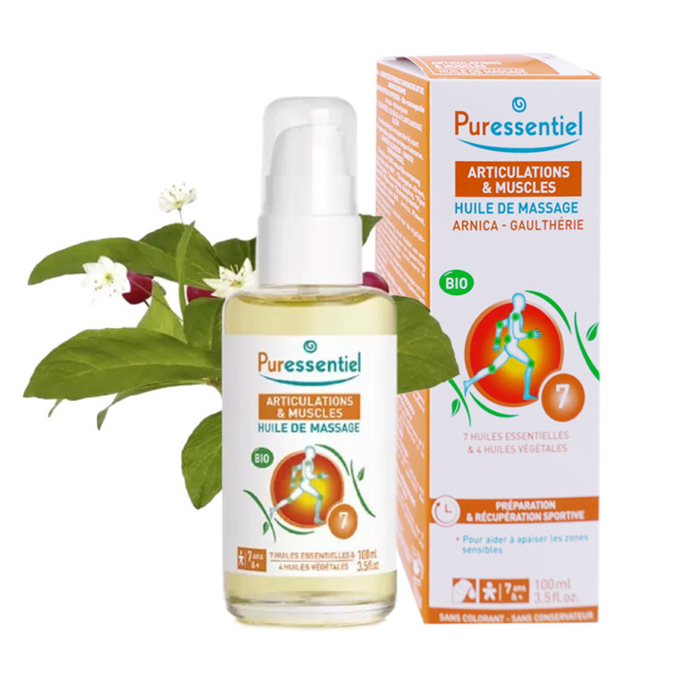 Puressentiel propose un large choix de produits d’aromathérapie et de cosmétique naturelle formulés à base d’huiles essentielles et d’actifs issus de la nature pour assurer santé et bien-être à l’organisme dans le respect son environnement. La gamme Puressentiel Articulations offre des produits formulés à base d’huiles essentielles pour apaiser les tensions musculaires et articulaires. L’huile de massage est composée d’ huiles essentielles de gaulthérie, d'eucalyptus, de genièvre, de lavande, de menthe poivrée et de romarin associées à des huiles végétales d'arnica, de piment, de reine des prés et de sésame aux propriétés antalgiques, anti-inflammatoires, décontractantes, anti-rhumatisme, échauffantes et adoucissantes pour préparer efficacement le muscle à un effort, prévenir les crampes ou les courbatures, soulager les douleurs musculaires et améliorer la souplesse articulaire.