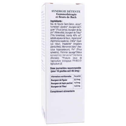 Ce complément alimentaire est formulé à partir d'ingrédients soigneusement sélectionnés pour leurs propriétés bénéfiques. Il est composé de macérats de bourgeons (tilleul, figuier, sapin pectiné) et de fleurs de Bach (aigremoine, chêne, impatiente, marronnier blanc, pin, pommier sauvage, verveine) pour offrir une détente profonde.