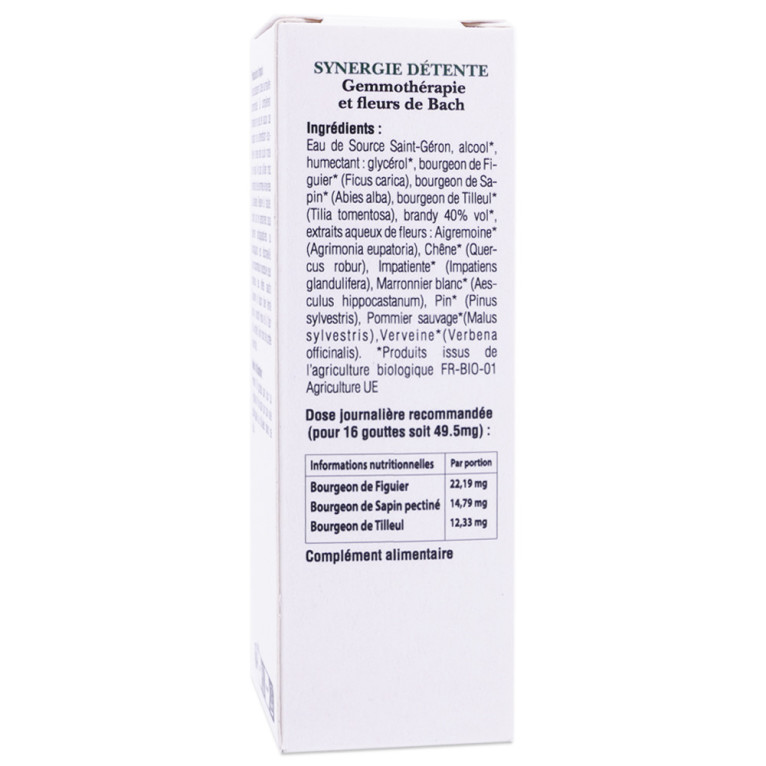 Eau de Source Saint-Géron, alcool*, humectant : glycérol*, bourgeon de Figuier* (Ficus carica), bourgeon de Sapin* (Abies alba), bourgeon de Tilleul* (Tilia tomentosa), brandy 40% vol*, extraits aqueux de fleurs : Aigremoine* (Agrimonia eupatoria), Chêne* (Quercus robur), Impatiente* (Impatiens glandulifera), Marronnier blanc* (Aesculus hippocastanum), Pin* (Pinus sylvestris), Pommier sauvage*(Malus sylvestris),Verveine*(Verbena officinalis). *Produits issus de l’agriculture biologique FR-BIO-01 Agriculture UE