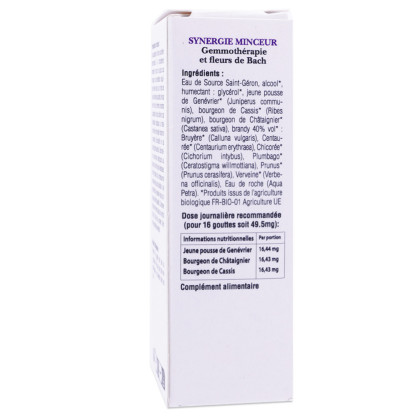 Ce complément alimentaire est constitué de bourgeons (cassis, châtaignier, genévrier) et de fleurs de Bach (bruyère, centaurée, chicorée, eau de roche, plumbago, prunus, verveine) qui favorisent le drainage et soutiennent la volonté de réduire la consommation alimentaire.