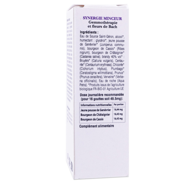 Eau de Source Saint-Géron, alcool*, humectant : glycérol*, jeune pousse de Genévrier* (Juniperus communis), bourgeon de Cassis* (Ribes nigrum), bourgeon de Châtaignier* (Castanea sativa), brandy 40% vol* : Bruyère* (Calluna vulgaris), Centaurée* (Centaurium erythraea), Chicorée* (Cichorium intybus), Plumbago* (Ceratostigma willmottiana), Prunus* (Prunus cerasifera), Verveine* (Verbena officinalis), Eau de roche (Aqua Petra)*Produits issus de l’agriculture biologique FR-BIO-01 Agriculture UE