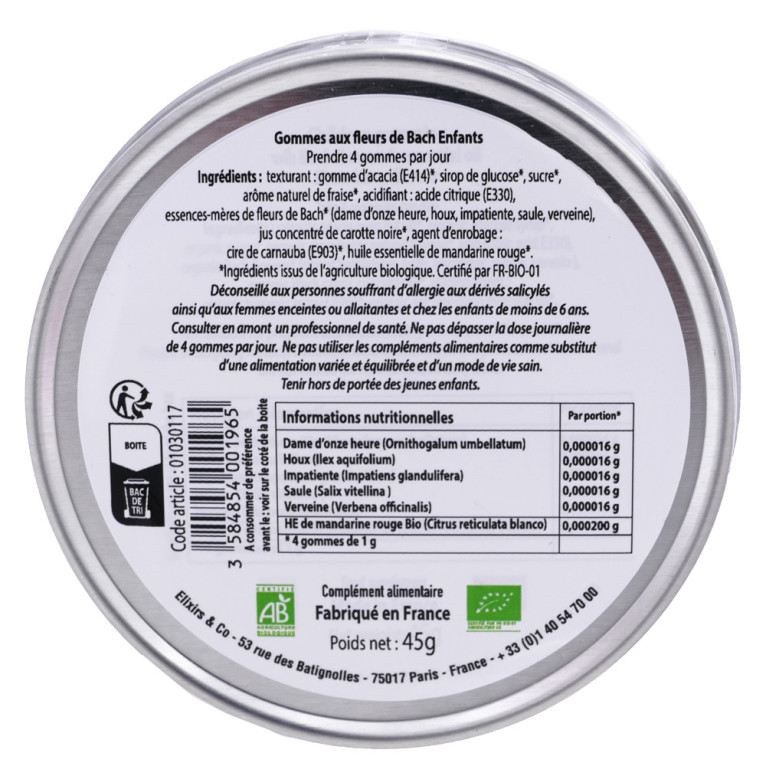 Ingrédients : Gomme d’acacia*, sirop de blé*, sucre de canne*, arôme naturel de fraise*, acidifiant, acide citrique, essence mère de fleurs de Bach*,(dame d’onze heure, houx, impatiente, saule, verveine) jus concentré de carotte noire*, HE de mandarine rouge*, agent d’enrobage : huile de tournesol*, cire de carnauba*. *Ingrédients issus de l’agriculture biologique. Certifié par FR-BIO-01