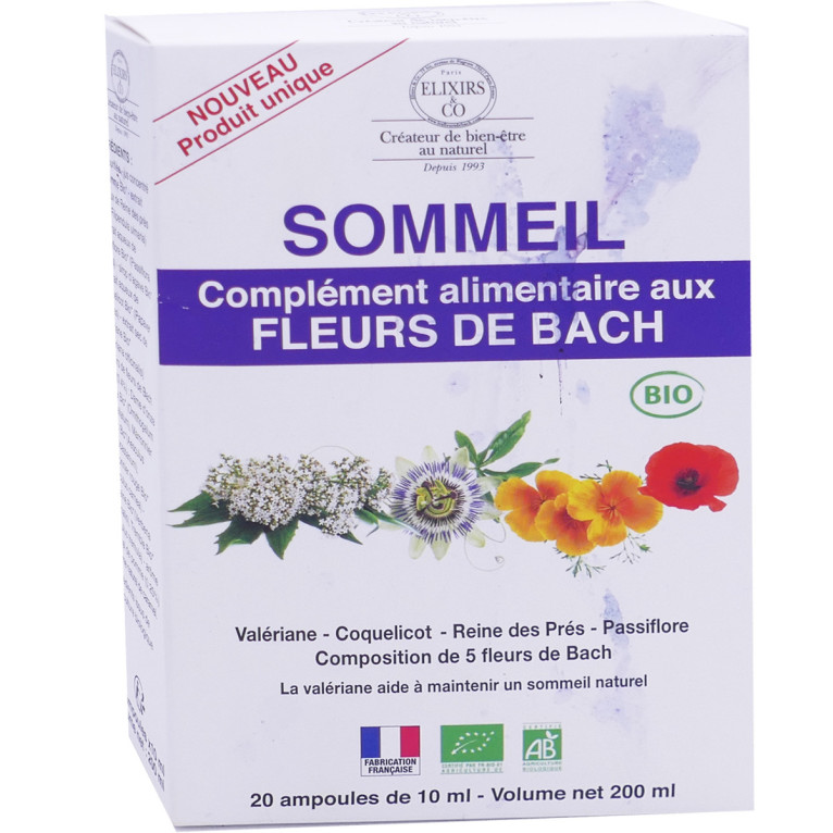 Les Fleurs de Bach sont des élixirs et parfums à base de végétaux naturels pour améliorer le bien-être, retrouver un bon équilibre émotionnel et naturel. Les fleurs de Bach sont élaborées en respectant rigoureusement la méthode originale et l’esprit authentique du Docteur Bach. Sommeil Complément alimentaire aux Fleurs de Bach d’Elixirs & CO est un complément alimentaire conditionné en ampoules buvable, composé de 5 fleurs de Bach (dame d’onze heure, marronnier blanc, marronnier rouge, verveine, tremble) et de plantes (racine de valériane, reine des près, passiflore, coquelicot). La valériane aide à maintenir un sommeil naturel. Le coquelicot favorise l'endormissement et la qualité du sommeil.
