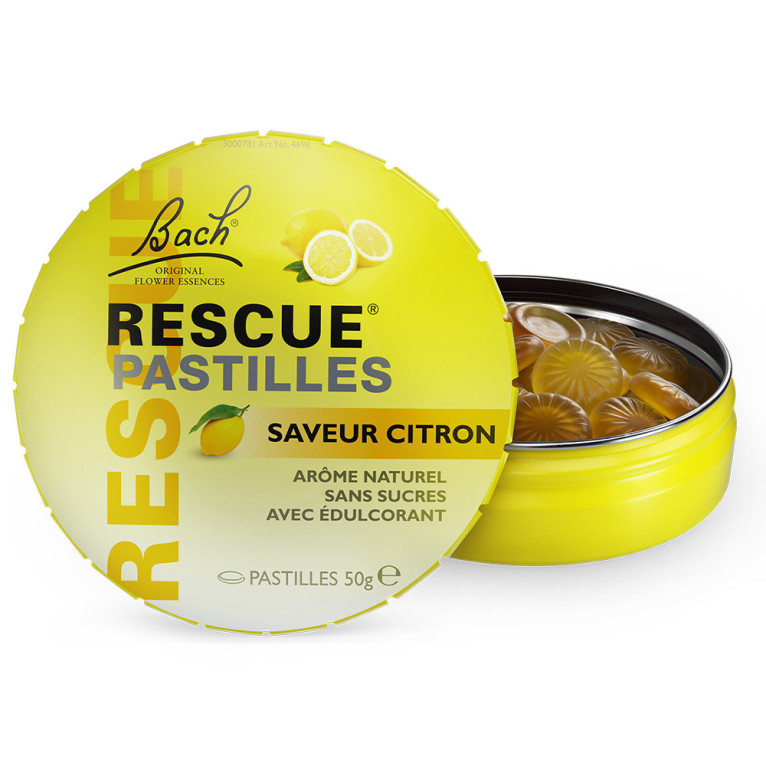RESCUE PASTILLES Saveur Citron de FLEURS DE BACH ORIGINAL sont des bonbons sans sucres ni alcool avec édulcorants composé de 5 fleurs de bach Originales: Rock rose, Impatiens, Clematis, Star of Bethlehem et Cherry plum aux arômes naturels frais de Citron.