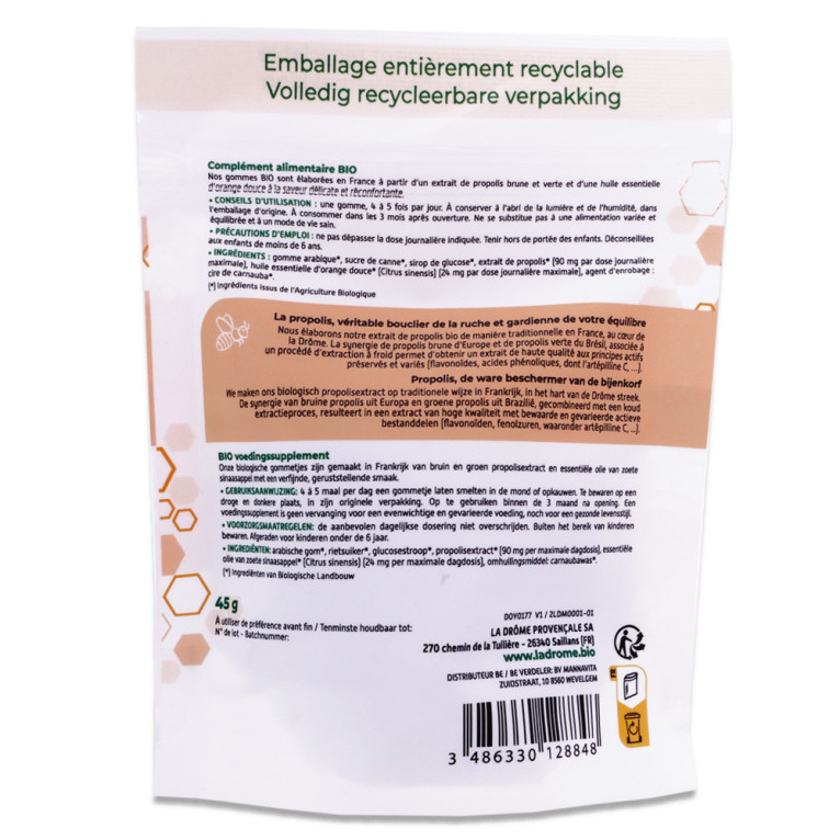 Complément alimentaire bio à base de propolis et plante. gomme arabique* (Acacia sp.), sucre de canne*, sirop de glucose*, extrait de propolis* (90 mg par dose journalière maximale), huile essentielle d’orange douce* (Citrus sinensis) (24 mg par dose journalière maximale), agent d’enrobage : cire de carnauba*. (*) Ingrédients issus de l’Agriculture Biologique. La liste des ingrédients peut être soumise à des variations, nous vous conseillons de toujours vérifier la liste figurant sur le produit acheté.