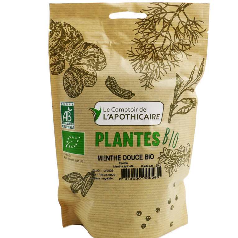 Menthe douce BIO du laboratoire Le Comptoir de l'Apothicaire, est une infusion. La menthe douce bio est une plante à tisane et ce sont ici les feuilles qu'il convient d'arroser d'eau bouillante et de laisser infuser 5 à 10 minutes selon les goûts.