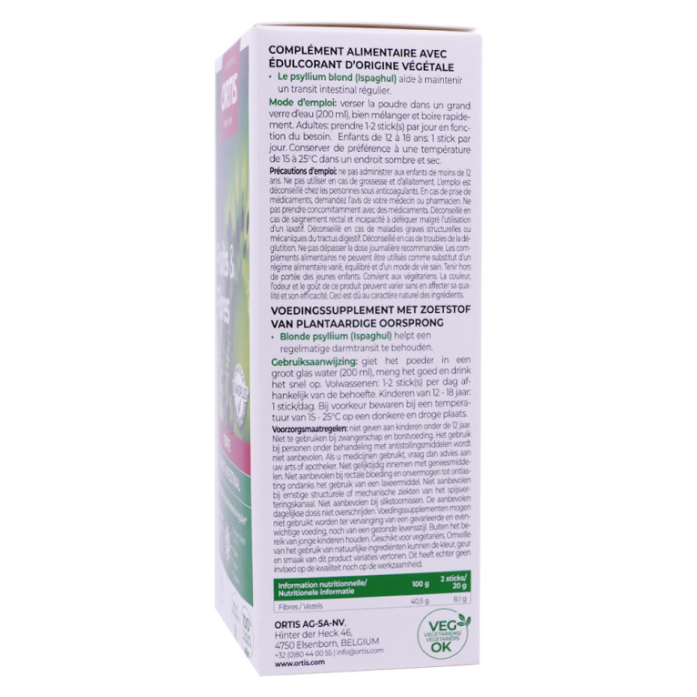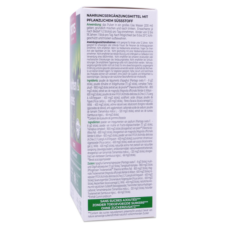 Poudre de téguments d'ispaghul (Plantago ovata F. – 8 g/2 sticks), poudre d'inuline et d'oligofructose (7,1 g/2 sticks), complexe Transiplus® - 1800 mg/2 sticks (extrait sec de pivoine** (Paeonia lactiflora Pall. – 800 mg/2 sticks), extrait sec de magnolia (Magnolia officinalis Rehder & Wilson – 600 mg/2 sticks), poudre de kiwi FFG® (Actinidia deliciosa (A.Chev.) C.F.Liang & A.R.Ferguson – 400 mg/2 sticks)); acidifiant: acide citrique; poudre de figues (Ficus carica L. – 600 mg/2 sticks), fibres d'acacia (Acacia senegal (L.) Willd. – 400 mg/2 sticks), arôme naturel avec édulcorant d'origine naturelle (glycosides de steviol), anti-agglomérant: carbonate acide de sodium; poudre de tamarin (Tamarindus indica L. – 320 mg/2 sticks), extrait sec de sureau (Sambucus nigra L. – 66 mg/2 sticks). **Contient de la poudre de gomme d'acacia