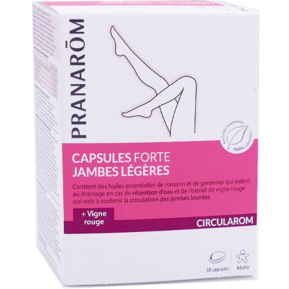 Pranarom Circularom Capsules Forte Jambes Légères est un complément alimentaire à base d'huiles essentielles et de vigne rouge qui aide à soutenir la circulation des jambes lourdes. Proposé en ligne dans votre parapharmacie discount.