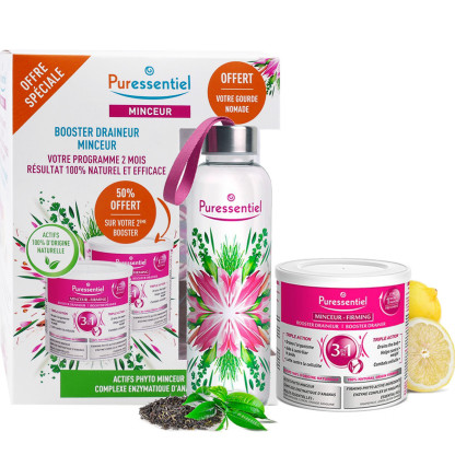 PURESSENTIEL MINCEUR Coffret Booster discount, 100% d’ingrédients d’origine naturelle pour retrouver une belle silhouette ! Dans votre parapharmacie en ligne à prix discount. 2 Booster Draineur (2 x 240g) + gourde (offerte)