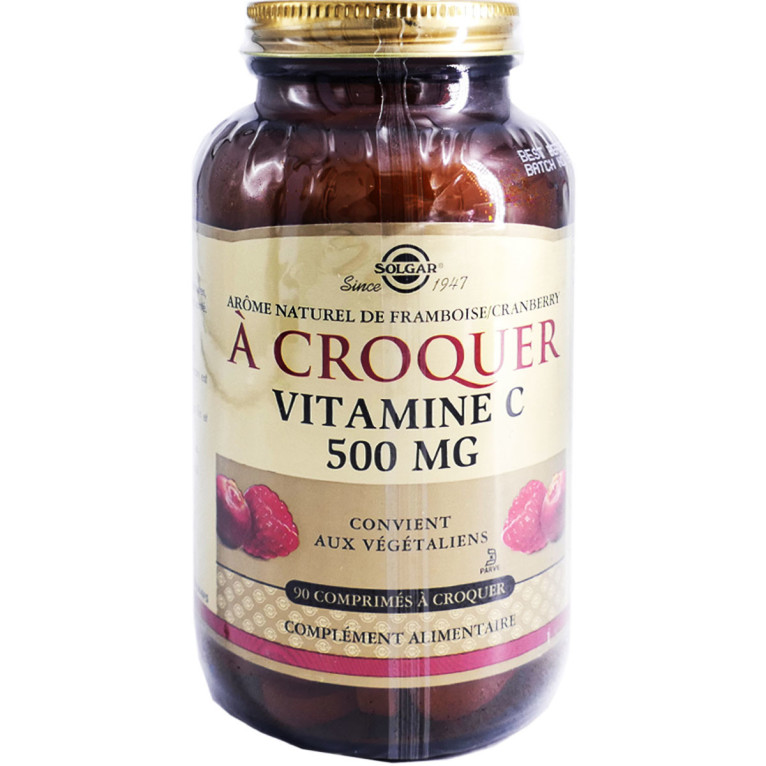 VITAMINE C 500 MG A CROQUER de SOLGAR est un complément alimentaire qui apporte de la vitamine C : 500 mg par comprimés à croquer. VITAMINE C 500 A CROQUER de SOLGAR, à l'arôme naturel de framboise et cranberry, convient aux végétariens, aux végétaliens et est garanti sans gluten, et Kasher.