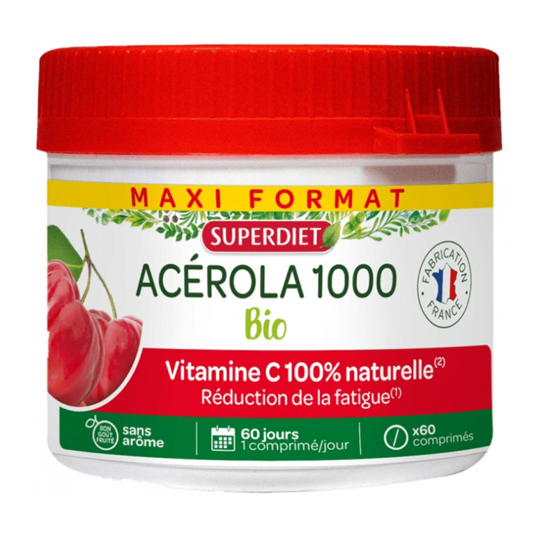Acérola 1000 bio discount de SUPERDIET, le complément alimentaire conditionné sous forme de comprimés à croquer à forte teneur en vitamine C, dans votre parapharmacie en ligne à prix discount.