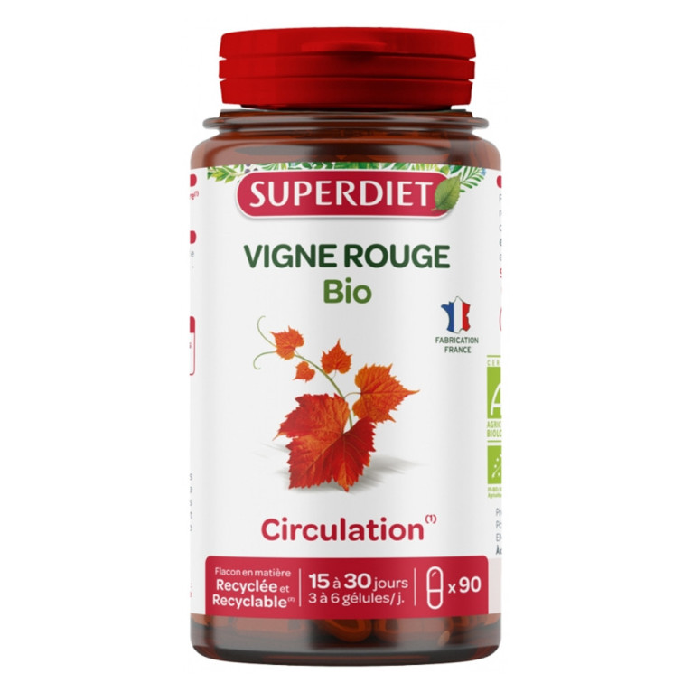 VIGNE ROUGE Bio de SUPER DIET est un complément alimentaire conditionné sous forme de gélules à base de Vigne Rouge.La vigne rouge cultivés en Europe depuis l'Antiquité, est un arbrisseau à sarments d'ou partent plusieurs tiges grimpantes aux feuilles palmées vertes au primtemps rougissant en automne.En phytothérapie, on utilise ses feuilles, la peau et les pépins de ses fruits.La vigne rouge aide à maintenir les fonctions veineuses des jambes en bonne santé et réduire la sensation de jambes lourde ou fatiguées.De plus, elle contient des antioxydants naturels qui aident à protéger vos cellules et vos tissus de l'oxydation.Pour finir , la vigne rouge contribue à une pression sanguine saine.