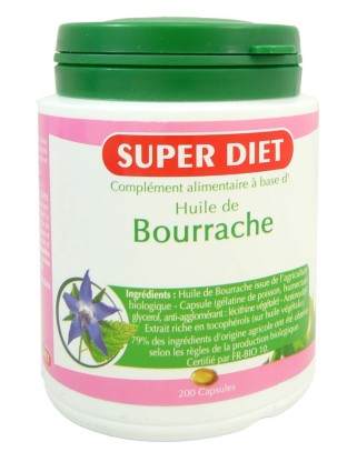 Huile de bourrache de SUPER DIET est un complément alimentaire conditionné sous forme de capsules à base d’huile de bourrache riche en acides gras essentiels polyinsaturés et plus particulièrement en acide gamma-linoléique.La bourrache est une plante poussant dans les régions de Méditerranée caractérisée par ses superbes fleurs bleues étoilées.