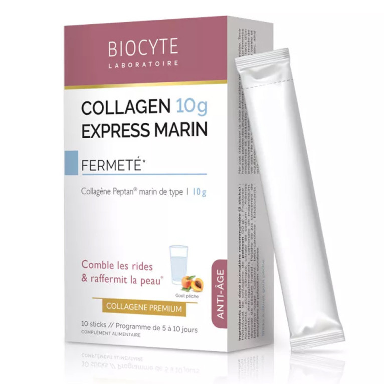 Collagen express de BIOCYTE, le complément alimentaire sous forme de sticks à base de collagène qui augmente la densité de collagène dans la peau. A partir de 35 ans.