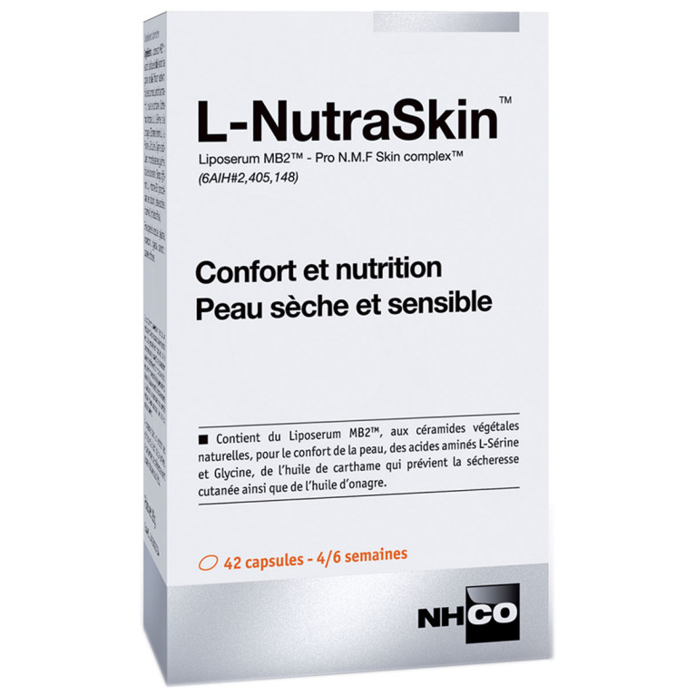L-NUTRASKIN Confort et Nutrition Peau sèche et sensible de NHCO, est un complément alimentaire associant plusieurs complexes pour les peaux sèches et sensibles. Le complexe Liposerum MB2™ est composé notamment d’extrait lipidique de blé aux acides gras et céramides naturels, de L-Sérine, de Glycine, d’huile de carthame et d’onagre va améliorer l’aspect et le confort de la peau, tandis que le complexe Ictyol.obc™ est composé essentiellement d’huiles végétales d’Onagre, de Bourrache et de Carthame qui favorise l'hydratation de la peau. Enfin le complexe Pro N.M.F est composé de bêta-carotène, provitamine A et acides aminés spécifiques pour une action optimale afin de contribuer au maintien d’une peau normale, plus douce, apaisée et confortable.