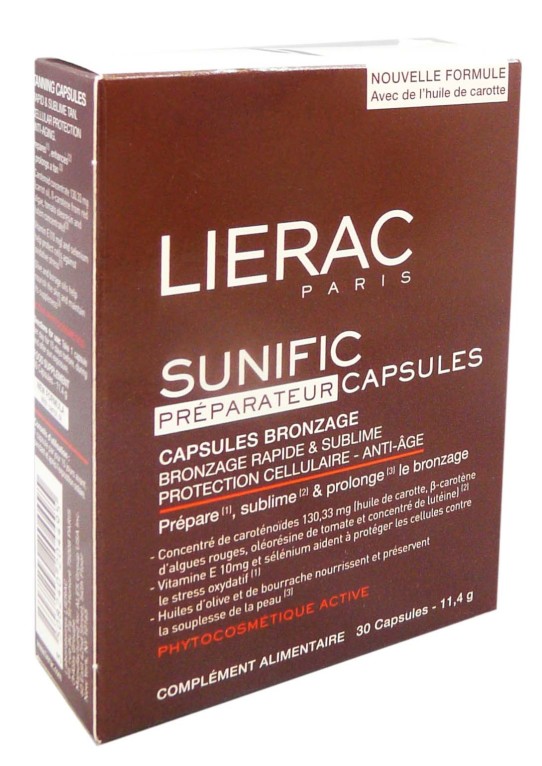 LIERAC est la première marque française dermo-cosmétique spécialisée dans la correction du vieillissement et des désordres cutanés, et instauratrice de la « cosmétique technique » qui allie plaisir des sens et efficacité. La gamme Sunific de LIERAC est composée de produits solaires, de laits après soleil et de préparateurs aux expositions au soleil pour sublimer le bronzage ! Préparateur Sunific de LIERAC conditionné en capsules, prépare la peau à l’exposition au soleil, accélère le bronzage et le prolonge même sans soleil, tout en protégeant les cellules cutanées du vieillissement prématuré causé par les expositions au soleil, nourrit la peau, et l’assouplit grâce à l’huile de carotte, au concentré de caroténoïdes dosé à 130,33mg qui est composé d’huile de carotte, de B-carotène d’algues rouges, d’oléorésine de tomate et de concentré de lutéine, avec des huiles d’olive et de bourrache qui sont riches en acides gras essentiels, de la vitamine E dosée à 10mg, du lycopène ainsi que du sélénium. La peau est sublimement bronzée et pour longtemps !