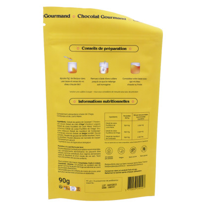 Extrait de graine de Cacaoyer (Theobroma cacao), extrait de corps fructifère de Lion’s Mane (Hericium erinaceus), extrait de corps fructifère de Chaga (Inonotus obliquus), extrait de Mycélium de Cordyceps (Cordyceps sinensis), poudre de gousse de vanille bourbon (Vanilla planifolia), poudre d’écorce de cannelle (Cinnamomum)