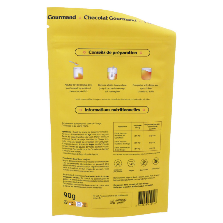 Ce complément alimentaire en poudre à reconstituer est issu de la marque Bonjour spécialisé dans les produits naturels. Chaque portion contient 2250 mg d’extraits concentrés de champignons biologiques, notamment Lion’s Mane, Chaga et Cordyceps. Ces champignons sont reconnus pour leurs propriétés bénéfiques sur l'organisme. Sans caféine, ce produit convient aux personnes sensibles à la caféine. De plus, il est vegan, sans lactose, sans sucres ajoutés, et exempt d’additifs ou de conservateurs, respectant ainsi les normes les plus strictes de pureté et de qualité.
