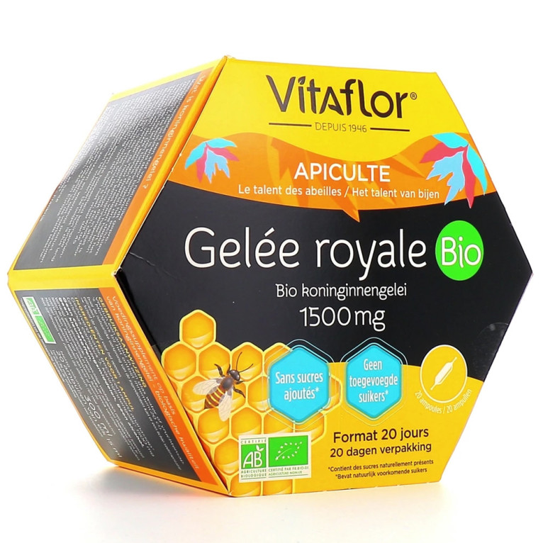 La gelée royale de Vitaflorbio contient 1500 mg par ampoule , substance naturelle produite par les abeilles à partir du pollen rapporté à la ruche par les ouvrières, est l'aliment des larves d'abeilles, mais également de la reine, pendant toute la durée de sa vie. L’espérance de vie d’une reine est de 5 ans, alors que celle de ses sujets n’excède pas 45 jours. La gelée royale, riche en minéraux, vitamines et oligo-éléments, est bénéfique pour les abeilles grâce à ses propriétés nutritives et antibactériennes.