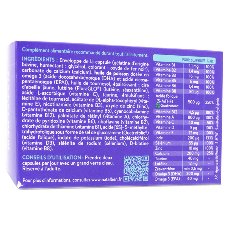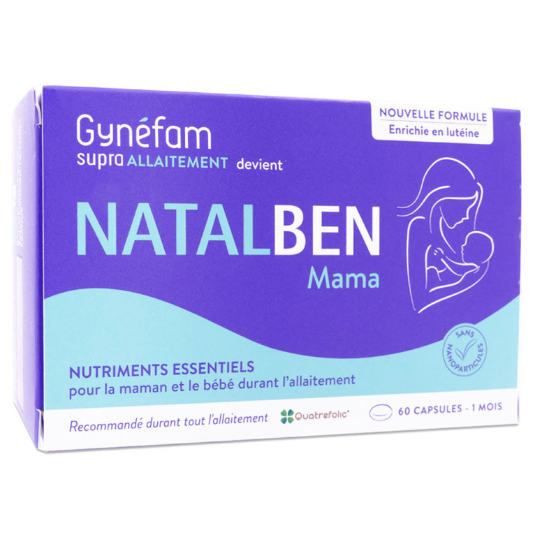 NATALBEN MAMA est un complément alimentaire sous forme de capsules, composé de vitamines B9 (acide folique) sous forme de Quatrefolic (forme biologique active pour une supplémentation optimale de folates), vitamines (B, A, C, D, et E), minéraux ainsi que d'oméga 3. NATALBEN MAMA est recommandé pour la maman et le bébé pendant toute la durée de l’allaitement.