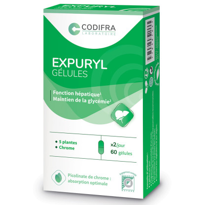 EXPURYL de CODRIFRA est un complément alimentaire à base de plantes et chrome. Sa composition associe de l’artichaut, du pissenlit, du cassis, de la cannelle et du chrome. Ce dernier contribue au maintien d'un taux de glycémie normal dans l'organisme, c'est un oligoélément essentiel pour le métabolisme des macro-nutriments.