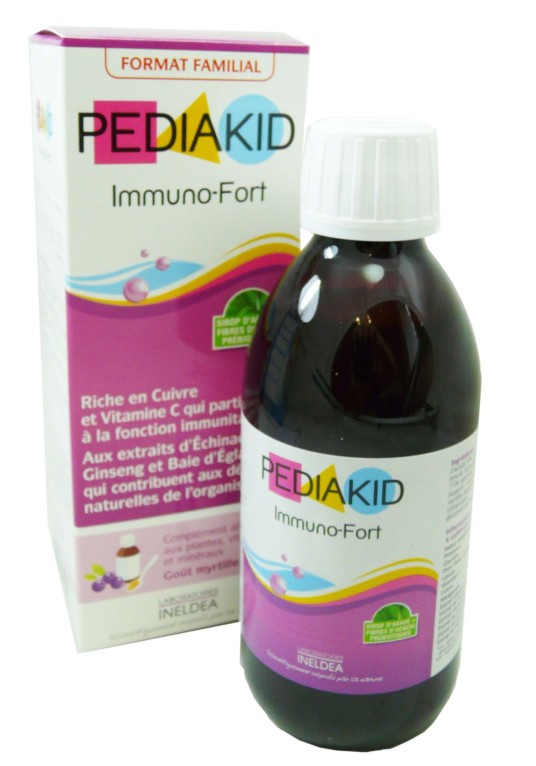 PEDIAKID Immuno-Fortifiant est un complément alimentaire au goût myrtille, composé d’extraits d’Echinacée, Ginseng, baie d’Eglantier, Acérola, Cynorrhodon, Brocoli, Vitamine C, Manganèse et Cuivre. Il est riche en Cuivre et en Vitamine C qui contribuent au fonctionnement normal du système immunitaire. L'échinacée pourpre, le ginseng et le Cynorrhodon participent aux défenses de l'organisme.