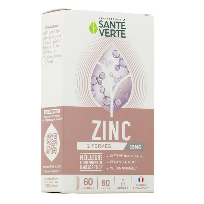 Le Zinc est un minéral essentiel qui joue un rôle crucial dans de nombreuses fonctions de l'organisme. Il contribue au bon fonctionnement du système immunitaire, maitien une vision, descheveux, une peau et des ongles normaux, et participe à la protection des cellules de l'organisme par ses propriétés antioxydantes. Les gélules de Zinc de Santé Verte contiennent une formule concentrée qui vous apporte toutes les propriétés de ce minéral en une seule prise quotidienne. Elles sont faciles à avaler et conviennent aux vegans. Ne laissez pas les carences en Zinc vous freiner, optez pour les gélules de Santé Verte et profitez de tous les avantages de ce minéral essentiel vendu sur votre site de parapharmacie en ligne !