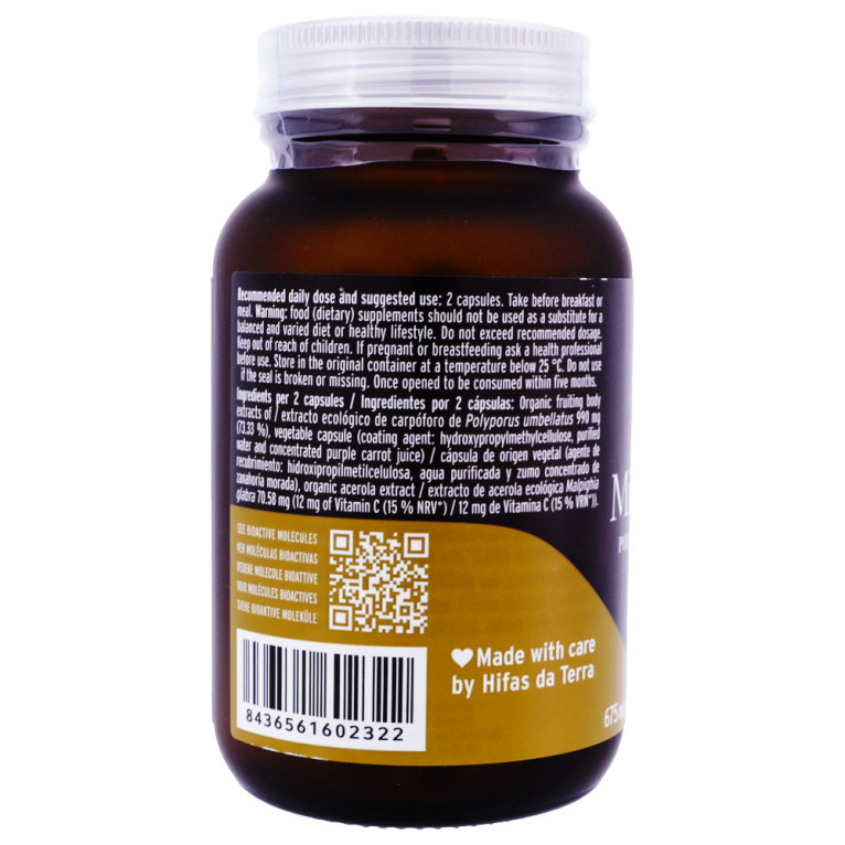 Produit sans allergènes conformément au règlement (UE) n°1169/2011. Produit sans gluten sans OGMextraits purs standardisés des carpophores de Polyporus umbellatus.Chaque gélule contient 495 mg d’extrait biologique de Polyporus umbellatus et 35,29 mg de jus concentré d’acérola biologique (Malpighia glabra) — soit 6 mg de vitamine C.