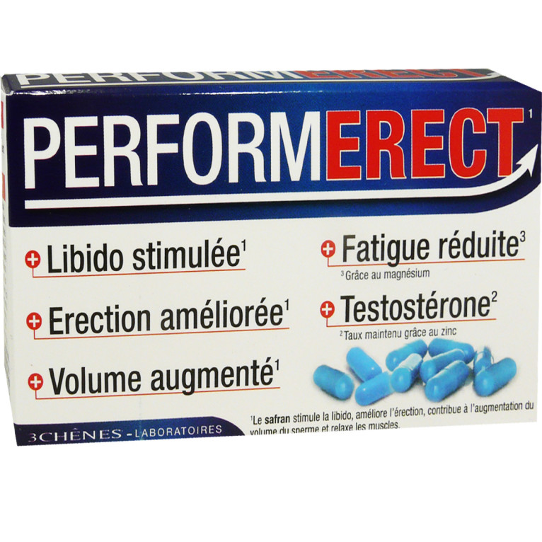 Les laboratoires 3 chênes développent depuis 1993 des compléments alimentaires et des produits cosmétiques aux formules innovantes et efficaces, élaborés à partir d’actifs naturels et biologiques, dédiés à la beauté, au bien-être de la famille. PERFORMERECT est un complément alimentaire conditionné sous forme de gélules. La formule de PERFORMERECT associe des extraits de plantes (safran, tribulus terrestris, ginseng) et des vitamines et minéraux (vitamines B et C, sélénium, zinc, magnésium). Le safran stimule la libido et améliore l'érection, il contribue également à l'augmentation du volume du sperme et détend les muscles. Le sélénium favorise une spermatogenèse normale. Le zinc aide à maintenir un taux normal de testostérone dans le sang et le ginseng favorise le maintien de bonne relation sexuelle. Enfin le magnésium et la vitamine C contribuent à réduire la fatigue. Ce complément alimentaire est à prendre 30 à 45 minutes avant l'acte sexuel.