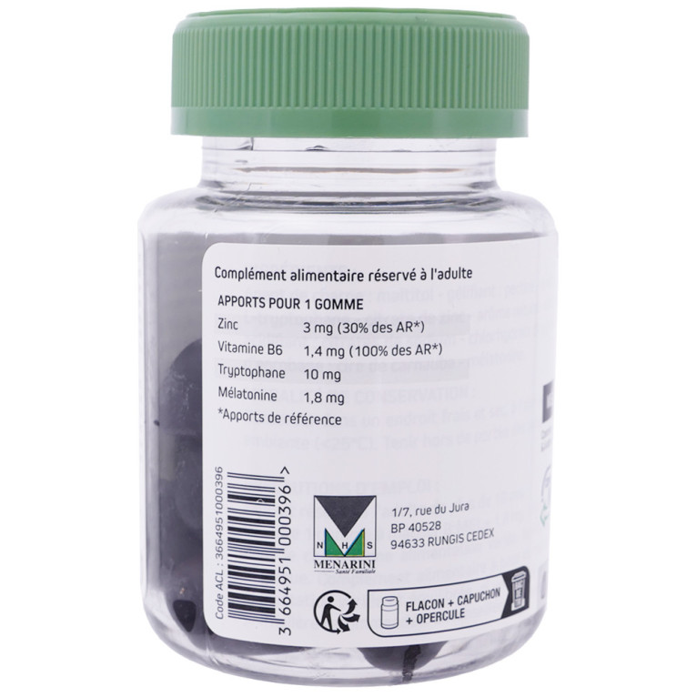 Agent de charge : maltitol – gélifiant : pectine – acidifiant : acide citrique – L‑tryptophane- citrate de zinc – arôme naturel – concentré (carotte et myrtille) – acidifiant : citrates de sodium – chlorhydrate de pyridoxine (vitamine B6) – agent d’enrobage : cire de carnauba – mélatonine. Apports pour 1 gomme : Zinc 3 mg (30% des AR*), Vitamine B6 1,4 mg (100% des AR*), Tryptophane 10 mg, Mélatonine 1,8 mg. *Apports de référence.