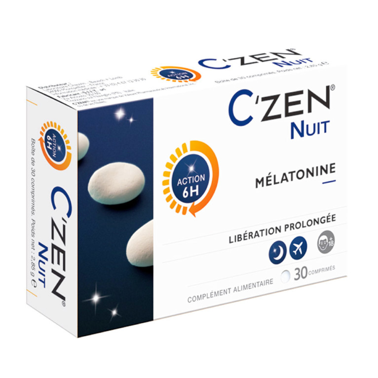 C'ZEN NUIT MELATONINE à libération prolongée 1MG 30 COMPRIMES est en vente en ligne sur le site de votre parapharmacie à prix discount. Ce complément alimentaire vous permettra de retrouver un sommeil réparateur grâce à sa formule à base de mélatonine.