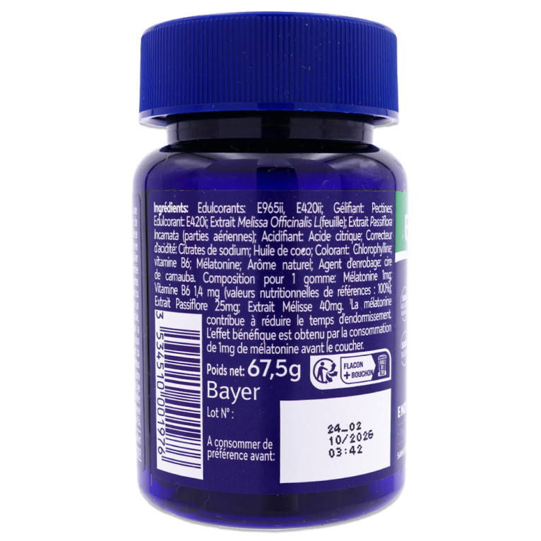 Edulcorants : E965ii, E420ii ; Gélifiant : Pectines ; Édulcorant E420i ; Extrait Melissa Officinalis L. (feuille) ; Extrait Passiflora incarnata (parties aériennes) ; Acidifiant : Acide citrique ; Correcteur d'acidité : Citrates de sodium ; Huile de Coco ; Colorant : Chlorophylline ; Vitamine B6 ; Mélatonine ; Arôme naturel ; Agent d'enrobage : cire de carnauba