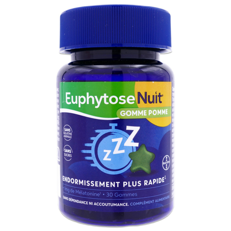 EUPHYTOSE NUIT GOMME POMME 30 GOMMES : profitez d'un sommeil apaisé grâce à sa formule enrichie en mélatonine, en vente en ligne sur le site de votre parapharmacie à prix discount. Ce complément alimentaire sous forme de délicieuses gommes à la pomme est idéal lors de difficultés à s'endormir ou de sommeil perturbé.