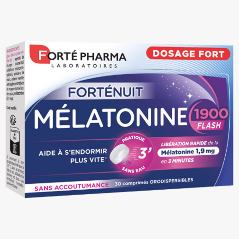 Depuis 1999, les Laboratoires FORTÉ PHARMA développent des compléments alimentaires et des médicaments de phytothérapie efficaces et innovants pour contribuer à renforcer les ressources vitales des consommateurs. L’univers santé de FORTÉ PHARMA propose des produits conçus pour traiter les petits troubles du quotidien : stress, sommeil, bouleversements hormonaux… et rétablir le bien-être. La mélato est une glande qui est sécrétée par le cerveau. Elle a pour fonction de favoriser et réguler les cycles de sommeil. TONINE 1900 FLASH est un complément alimentaire très concentré à base de 1.9mg de mélato, qui va agir très rapidement pour aider à mieux s’endormir et retrouver un sommeil réparateur pour un lendemain sans fatigue. Ces comprimés orodispersibles à laisser fondre sous la langue au goût vanille, permettent d’agir immédiatement pour un endormissement rapide, et agir de façon prolongée tout au long de la nuit pour un sommeil de qualité. Sans accoutumance
