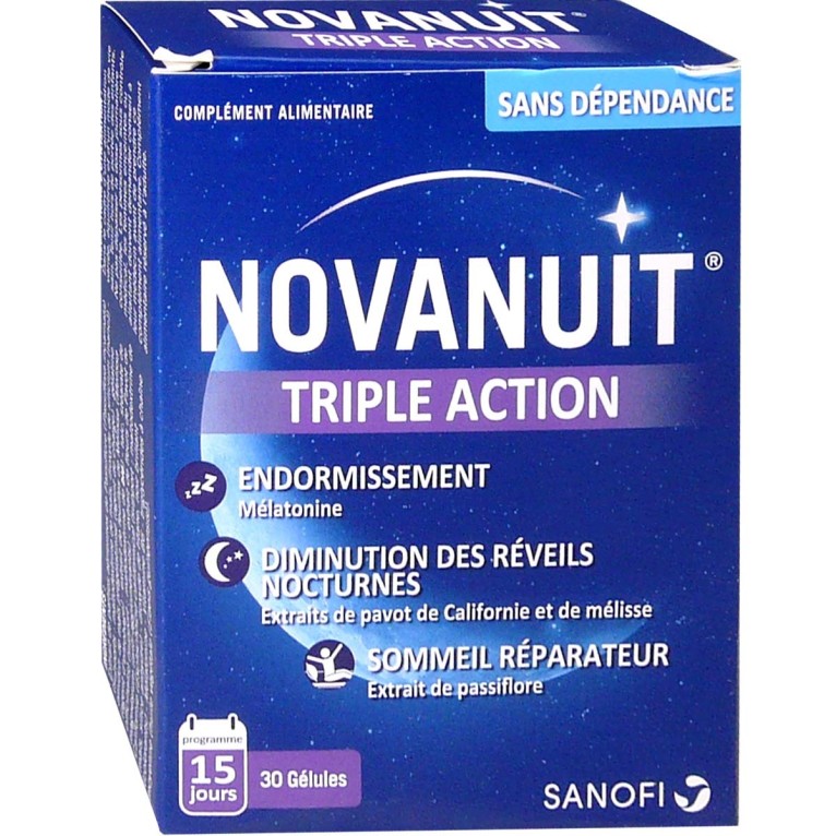 NOVANUIT Sommeil Triple action de SANOFI AVENTIS dans votre parapharmacie en ligne à prix discount, le complément alimentaire qui permet de diminuer les troubles du sommeil et retrouver des nuits réparatrices.