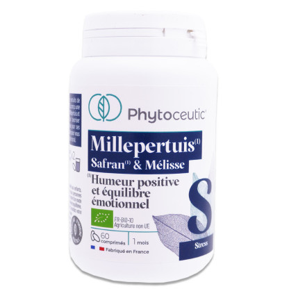 Les compléments alimentaires des laboratoires PHYTOCEUTIC à base d’ingrédients naturels biologiques et de produits de la ruche, répondent aux besoins du quotidien de toute la famille (minceur, beauté,…). Millepertuis Safran & Mélisse Humeur positive et Equilibre émotionnel est un complément alimentaire en comprimés, à base d’extraits de safran, de millepertuis et de mélisse. Ces actifs vont diminuer l’irritabilité et les troubles de l’humeur en rééquilibrant l’état émotionnel, favoriser le calme avant le coucher et l’endormissement, et diminuer la fatigue, le stress et l’anxiété. Rapidement l’humeur et les émotions sont rééquilibrées pour retrouver calme et sérénité.