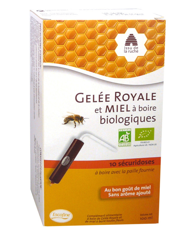Ingrédients par sécuridose de 10 ml : Miel biologique toutes fleurs* (4 800 mg) ; Gelée Royale biologique (1 000 mg) ; Eau purifiée (qsp : 10 ml). *Mélange de miels originaires de l'Union Européenne.
