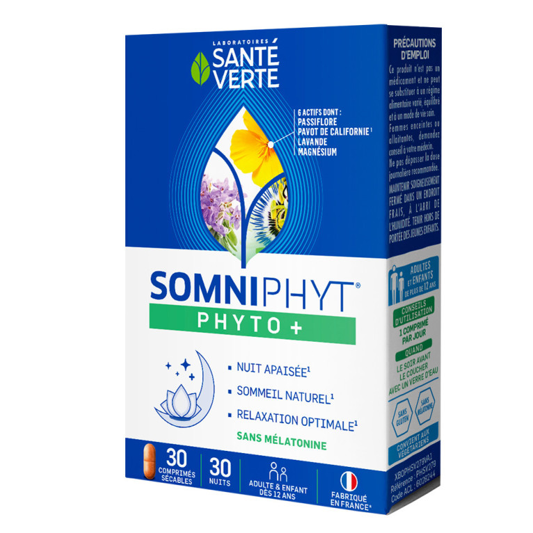 SOMNIPHYT est un complément alimentaire sous forme de comprimés contenant des extraits de plantes 100% d’origine naturelle : du tilleul, de l'eschscholtzia, du coquelicot, de la lavande et de la passiflore. L'eschscholtzia aide à soutenir la relaxation et améliore la qualité du sommeil naturel et la passiflore contribue à trouver un meilleur sommeil et à diminuer la tension nerveuse. Elle favorise également la relaxation. Ce complément alimentaire est sans accoutumance.
