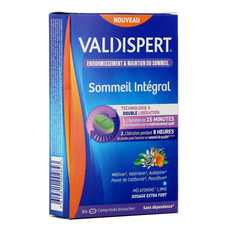 Découvrez le complément alimentaire VALDISPERT SOMMEIL INTEGRAL, élaboré par le laboratoire Valdispert, spécialiste des solutions naturelles pour le bien-être. Ces 30 comprimés contiennent deux couches : La première couche libère en 15 minutes 1,9mg de mélatonine. La Mélatonine aide à réduire le temps d'endormissement. La seconde couche, libère pendant 8 heures un mélange de plantes tels que la Mélisse, la Valériane, l'Aubépine, le Pavot de Californie ou encore la Passiflore. La mélisse soutient la relaxation et contribue à un sommeil normal. De plus, la valérine aide à maintenir un sommeil naturel. La Passiflore favorise également un bon sommeil. Et pour finir l'aubépine aide à réduire l'agitation et permet un meilleur sommeil. N' attendez plus pour retrouver un sommeil réparateur.