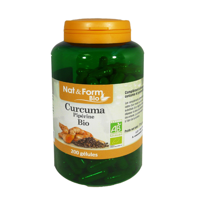 Curcuma Pipérine BIO des laboratoires Nat & Form le complément alimentaire conditionné sous forme de gélules. Son emballage d'origine végétale est 100% recyclable. Sa formule contient du Curcuma qui contribue à maintenir la flexibilité des articulation. Enfin la formule est complétée par de la poudre de poivre composée de pipérine.
