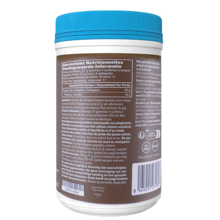 Peptides de collagène (origine bovine), cacao maigre en poudre (24 %) (Theobroma cacao (L.)), sel, édulcorant (glycosides de stéviol issus de stevia) Peut contenir du lait