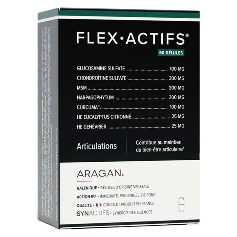 FLEXActifs des laboratoires SYNactifs est un complément alimentaire conditionné sous forme de gélules dont la formule associe des extraits de plantes, des huiles essentielles de MSM et de chondroïtine.Parmi les plantes on note la présence d'harpagophytum et de curcuma.L'harpagophytum aide à maintenir la souplesse des articulations tandis que le curcuma participe au soulagement des douleurs inflammatoires, musculaires et articulaires grâce au curcuma.Des huiles essentielles d'eucalyptus citronné et de genévrier viennent compléter la formule.
