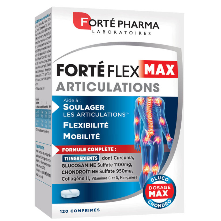 Forté Flex Max Articulations de Forté Pharma est un complément alimentaire sous forme de comprimés au dosage max, formulé à base de Curcuma, de sulfate de Glucosamine 1100mg, de sulfate de chodroïtine 950mg, de Collagène II, de vitamines C, D et du manganèse. Une formule complète qui réunit 11 ingrédients pour participer à la flexibilité, la mobilité et au confort articulaire et notamment de la Vitamine C qui contribue à la formation normale de collagène pour assurer la fonction normale des cartilages, de la vitamine D qui contribue au maintien d’une ossature normale et d’une fonction musculaire normale.