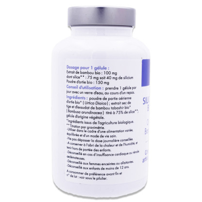 Dosage pour 1 gélule / jour : - Extrait de bambou bio : 100 mg dont silice : 75 mg dont silicium : 40 mg - Poudre d'ortie bio : 150 mg